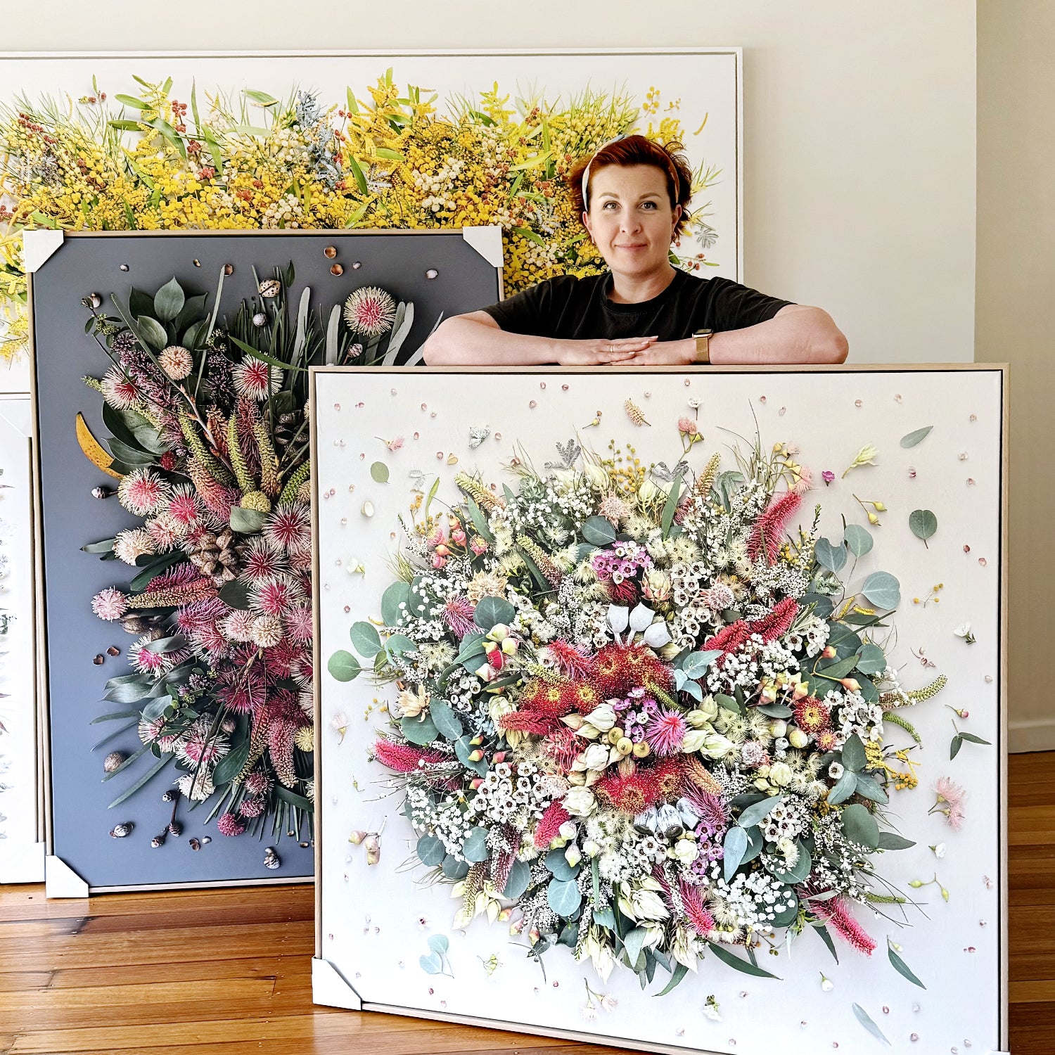 I create hand-arranged botanical artworks by photographing real flowers in layered compositions, achieving a distinctive dimensional look. Every piece is printed in a limited edition of 25 and signed for authenticity.